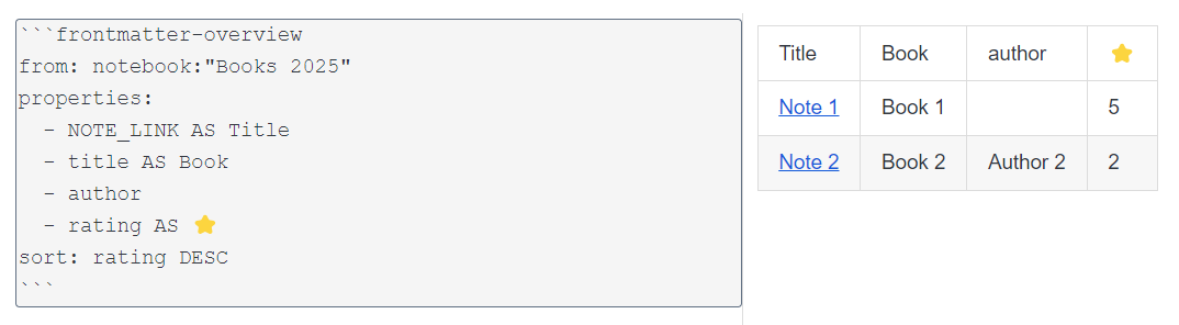 from: a Joplin search query to select notes, each note will become a row in the table.properties: list of frontmatter fields to include as table columns.- Use